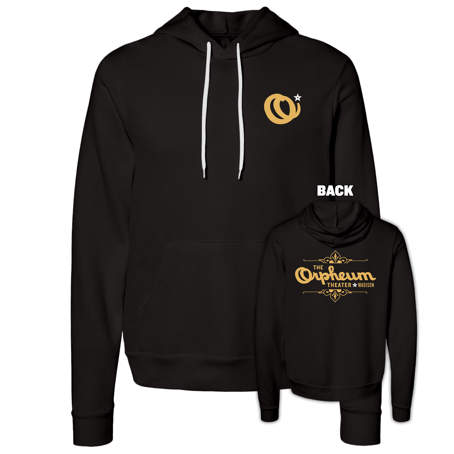 Sweatshirt in black, featuring The Orpheum Theater's "O" logo on the front left and the full Orpheum Theater logo on the back in gold.