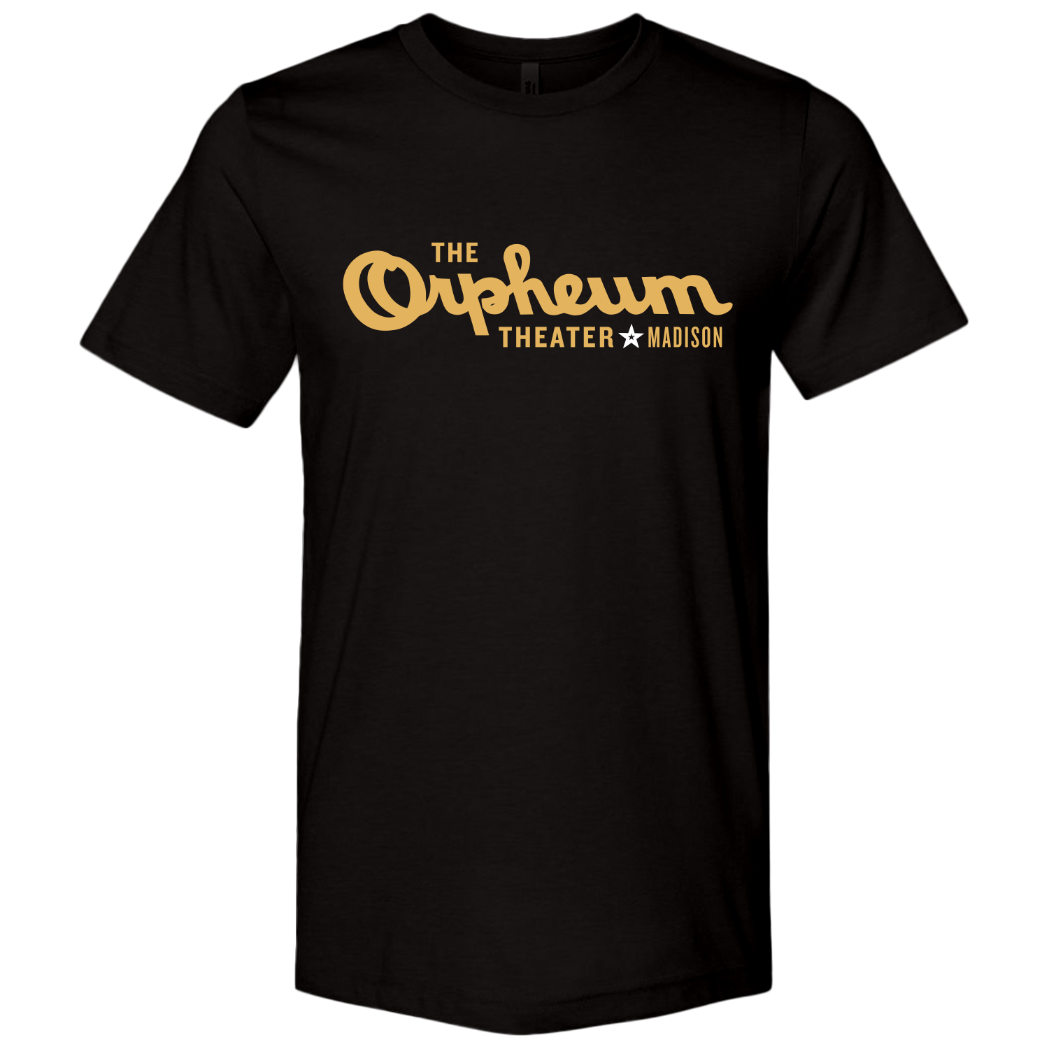 Shirt in black, featuring The Orpheum Theater's logo across the front in gold.